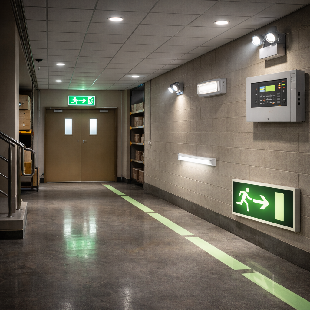 Emergency lighting systems provide automatic backup illumination during power failures or fire emergencies ensuring evacuation routes remain visible. Our systems use battery-powered lights that activate instantly when main power fails, providing adequate illumination for safe passage through corridors, stairways, and exits.